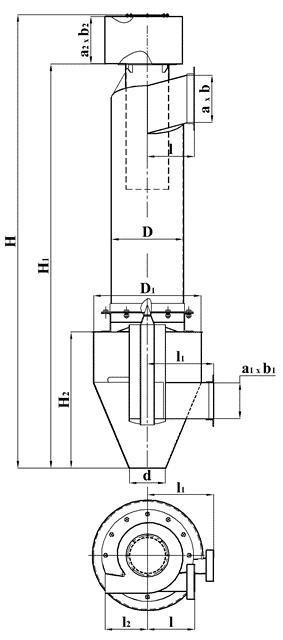Очищаемый воздух поступает в пылеуловитель двумя потоками через патрубки корпусов завихрителей верхнего и нижнего потоков воздуха. Проходя через корпусы завихрителей, воздушные потоки закручиваются в одну и ту же сторону навстречу друг другу. Пыль под действием центробежной силы отбрасывается к стенке, смывается нисходящим верхним потоком через кольцевую щель под отбойную шайбу в бункер и удаляется из него через переходник с затвором – мигалкой в пылесборник.